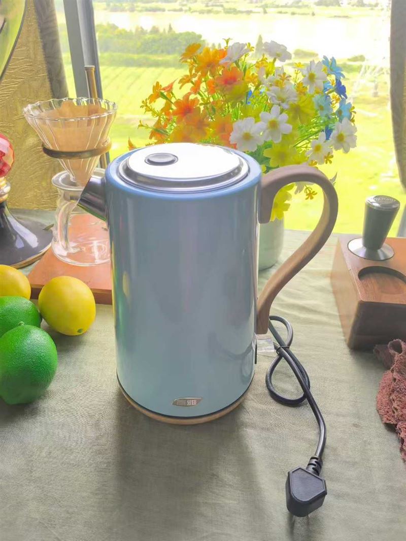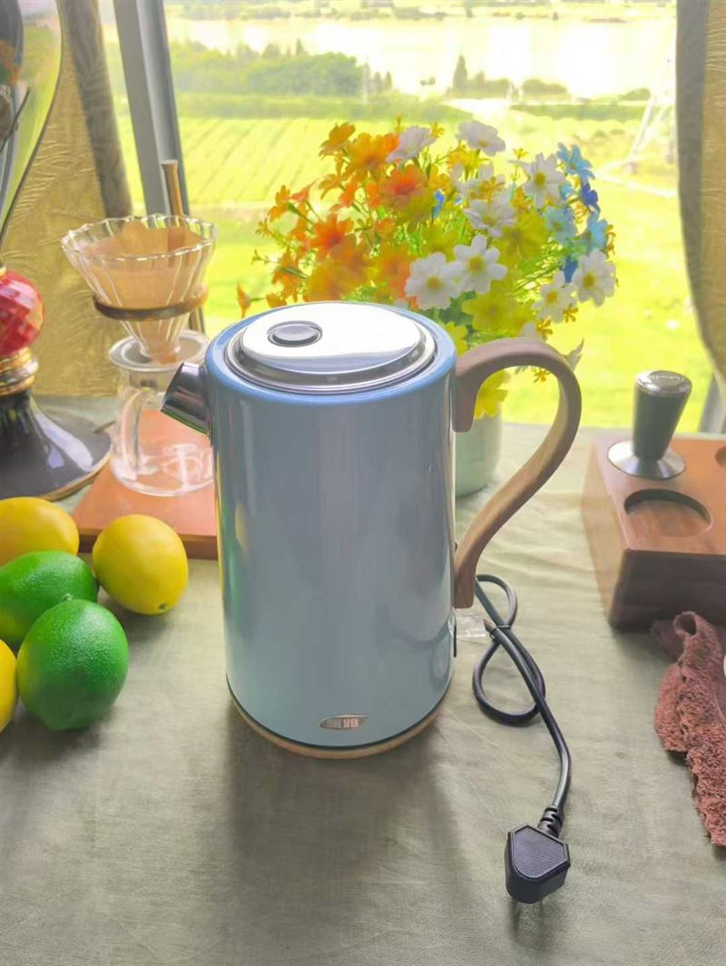 浅蓝色壶身,水壶中非常少见的颜色。木纹手柄+木纹底坐